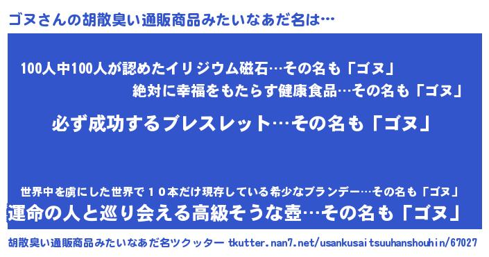 | 男性向けラノベタイトル風あだ名 | 『緋弾のゴヌ』『ゴヌアートオンライン』 |