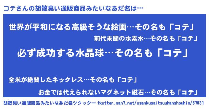 | 男性向けラノベタイトル風あだ名 | 『はたらくコテさま!』『コテの憂鬱』 |