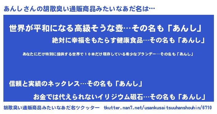 | 男性向けラノベタイトル風あだ名 | 『この素晴らしい世界にあんしを!』 |