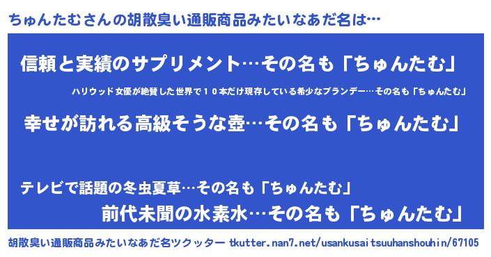 | 男性向けラノベタイトル風あだ名 | 『やはりちゅんたむの青春ラブコメはまちがっている 』 |