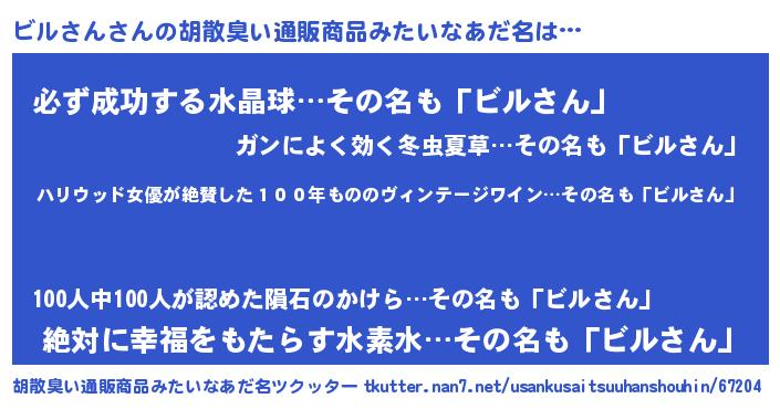 | 男性向けラノベタイトル風あだ名 | 『魔弾の王とビルさん』『ビルさんの憂鬱』 |