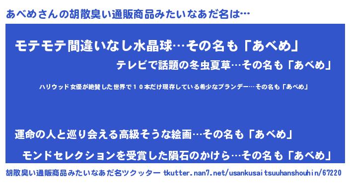 | 男性向けラノベタイトル風あだ名 | 『魔弾の王とあべめ』『あべめの憂鬱』 |