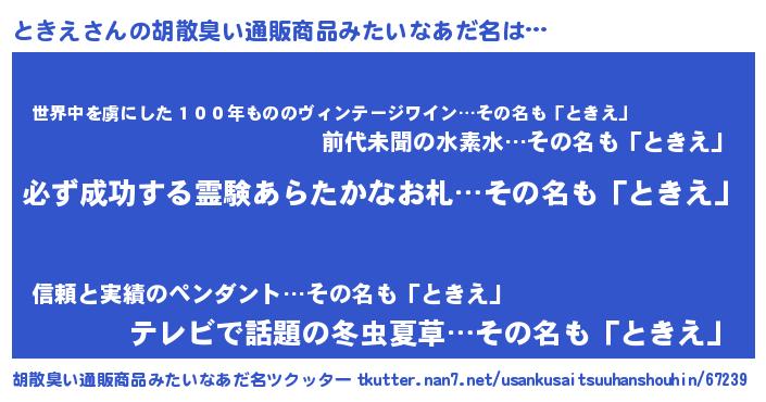 | ヘコむあだ名 | 『ときもー』『ときえ(小並感)』 |