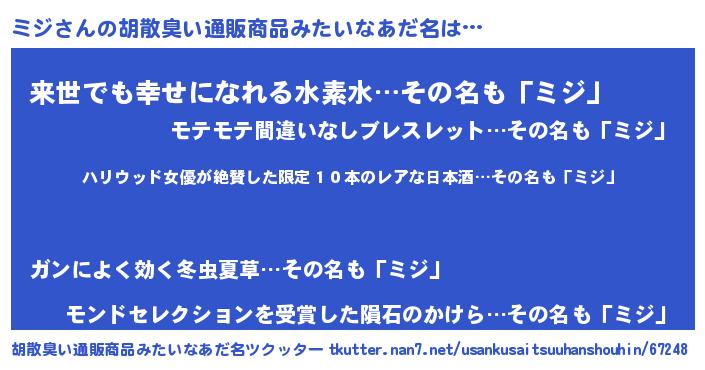 | 意味不明あだ名 | 『住所不定無職ミジ(50歳)』『永久保存ミジ』 |
