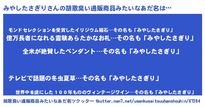 | 男性向けラノベタイトル風あだ名 | 『うちのみやしたさぎりが世界を掌握している!』 |