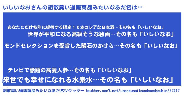 | 男性向けラノベタイトル風あだ名 | 『いしいなお~年齢イコール彼女いない歴の魔法使い~』 |