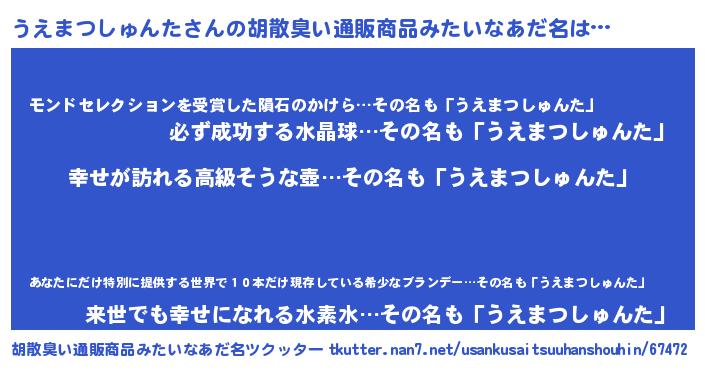 | 女子向けラノベタイトル風あだ名 | 『うえまつしゅんたの雑貨屋さん』 |