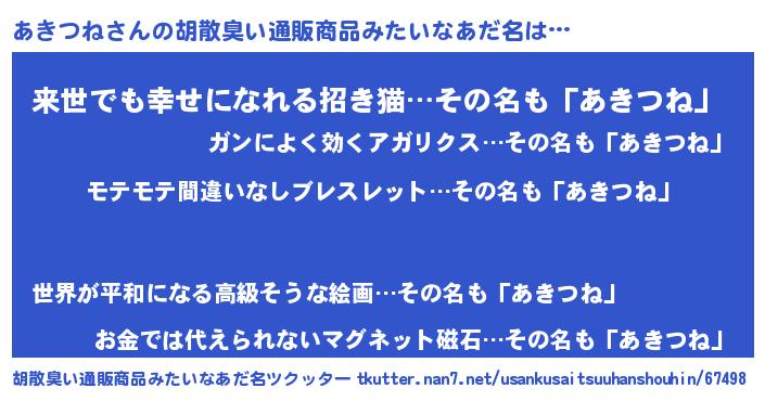 | 意味不明あだ名 | 『ペロリンあきつね』『永久保存あきつね』 |