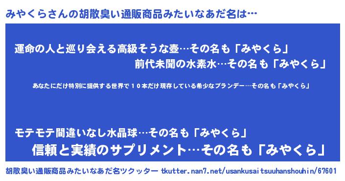 | 男性向けラノベタイトル風あだ名 | 『この素晴らしい世界にみやくらを!』 |