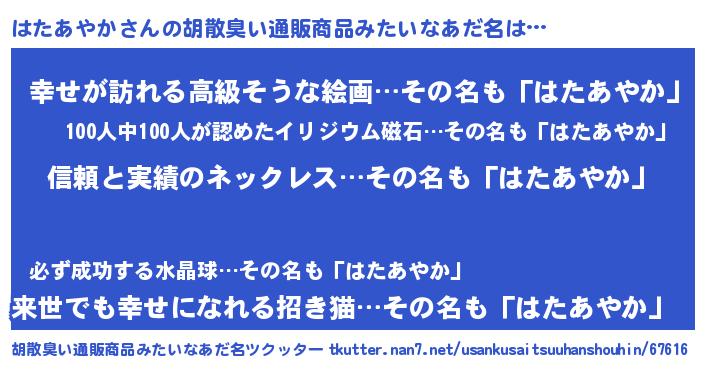 | ヒーロー風カッコイイあだ名 | 『暗黒騎士ハタ』『ネオハタアヤカ』 |