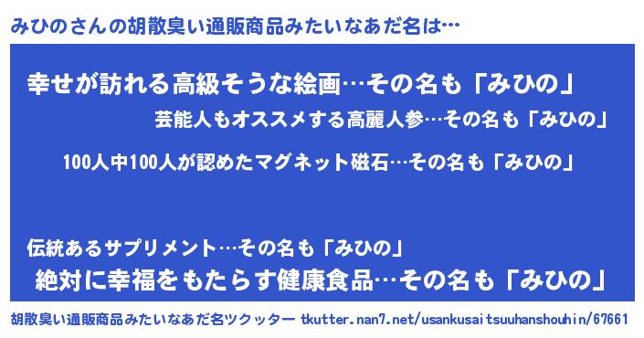 | 男性向けラノベタイトル風あだ名 | 『おまえをオタクにしてやるから、俺をみひのにしてくれ! 』 |