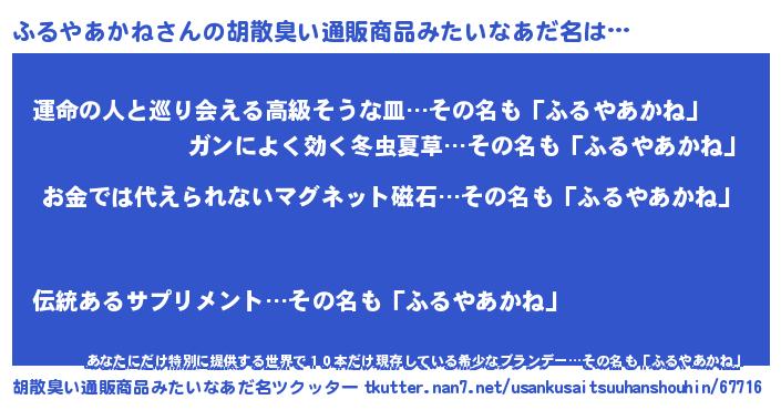 | 男性向けラノベタイトル風あだ名 | 『ノーゲーム・ノーフルヤアカネ』 |