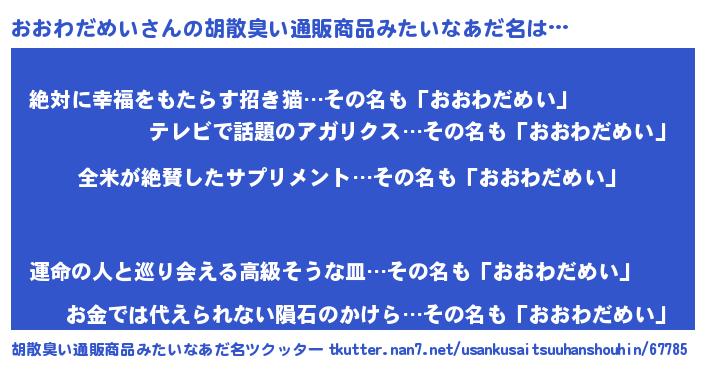 | 男性向けラノベタイトル風あだ名 | 『おおわだめいに滅ぼされるだけの簡単なお仕事です』 |