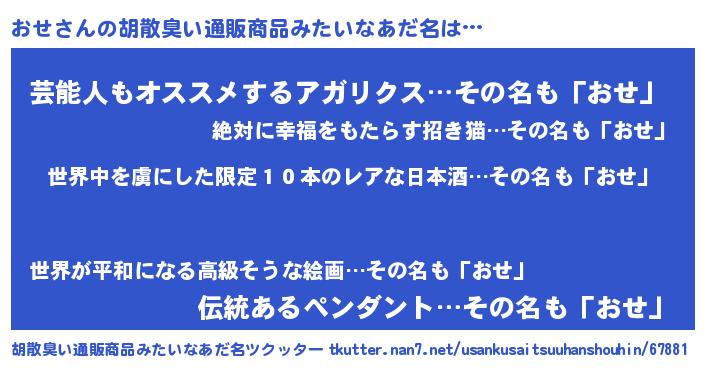 | 意味不明あだ名 | 『住所不定無職おせ(47歳)』『自称おせ』 |