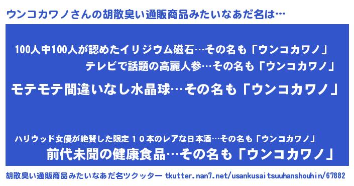 | 男性向けラノベタイトル風あだ名 | 『ウンコカワノアートオンライン』 |