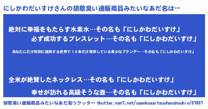 | 男性向けラノベタイトル風あだ名 | 『この素晴らしい世界ににしかわだいすけを!』 |