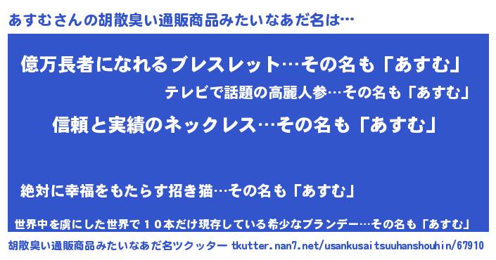 | 意味不明あだ名 | 『とにかく怪しいあすむ』『自称あすむ』 |