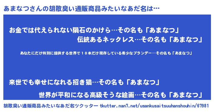 | 男性向けラノベタイトル風あだ名 | 『あまなつ~年齢イコール彼女いない歴の魔法使い~』 |