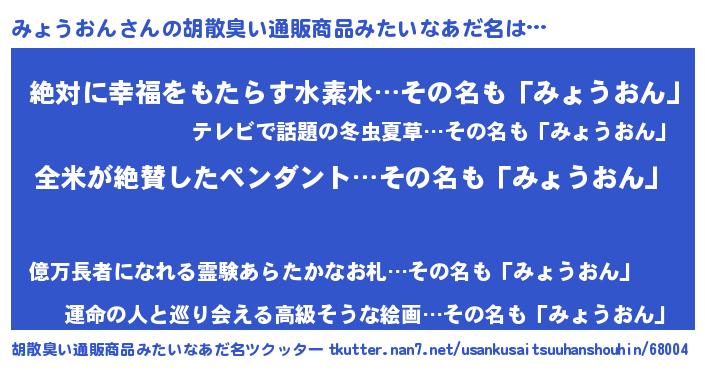 | 男性向けラノベタイトル風あだ名 | 『みょうおん~年齢イコール彼女いない歴の魔法使い~』 |