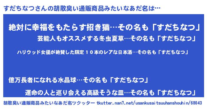 | 意味不明あだ名 | 『住所不定無職すだちなつ(40歳)』 |