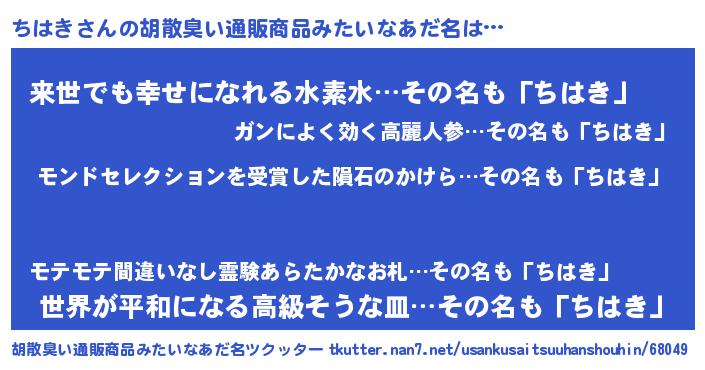 | 男性向けラノベタイトル風あだ名 | 『ちはきに滅ぼされるだけの簡単なお仕事です』 |