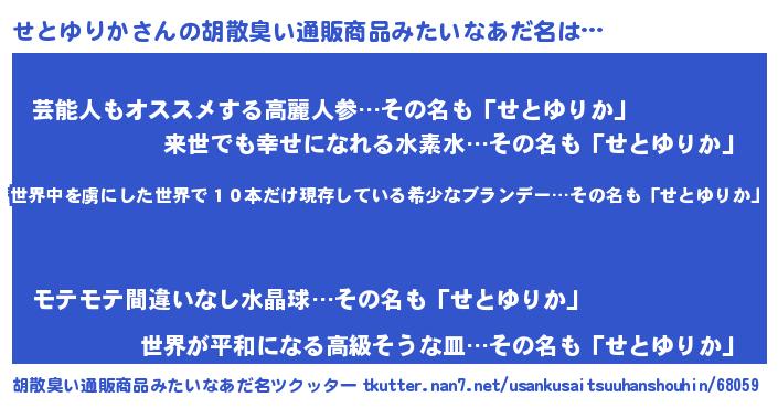| 恥ずかしいあだ名 | 『セトユリカデラックス』『せとっちょ』 |