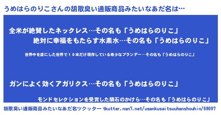 | 意味不明あだ名 | 『住所不定無職うめはらのりこ(74歳)』 |