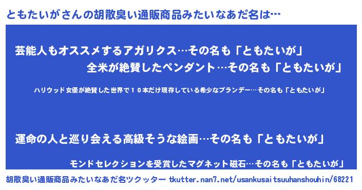 | 男性向けラノベタイトル風あだ名 | 『魔弾の王とともたいが』 |