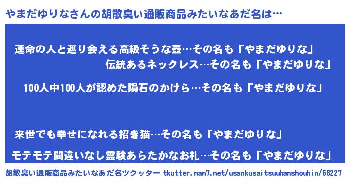 | 男性向けラノベタイトル風あだ名 | 『おまえをオタクにしてやるから、俺をやまだゆりなにしてくれ! 』 |