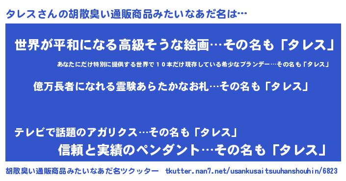 | 男性向けラノベタイトル風あだ名 | 『タレス~年齢イコール彼女いない歴の魔法使い~』 |