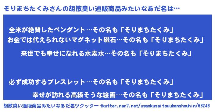 | ヘコむあだ名 | 『そりまちたくみ(苦笑)』『そりぷりん』 |
