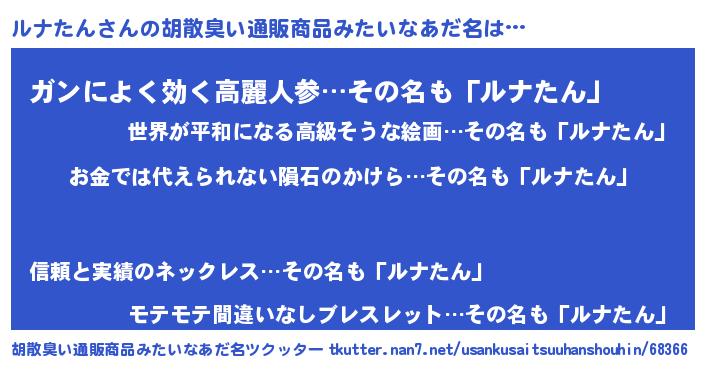 | 男性向けラノベタイトル風あだ名 | 『おまえをオタクにしてやるから、俺をルナたんにしてくれ! 』 |
