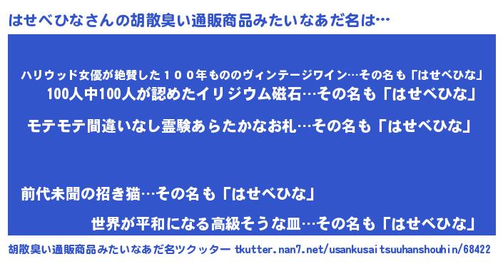 | 男性向けラノベタイトル風あだ名 | 『転生したらはせべひなだった件』 |