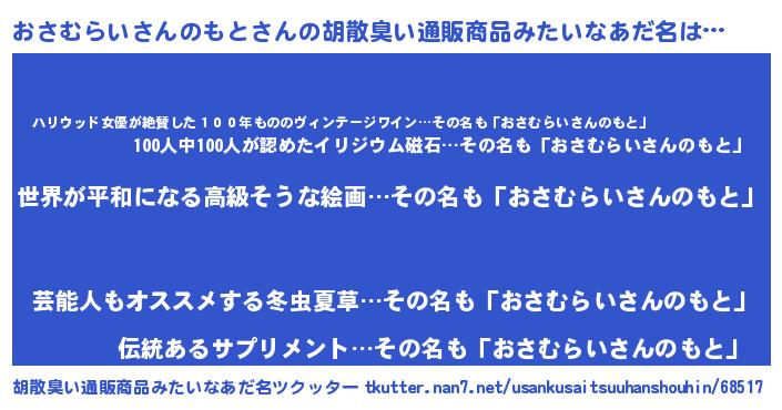 | 男性向けラノベタイトル風あだ名 | 『おさむらいさんのもとに滅ぼされるだけの簡単なお仕事です』 |