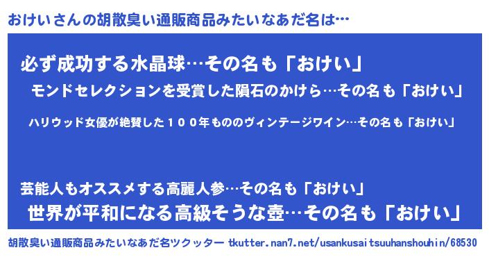 | 意味不明あだ名 | 『住所不定無職おけい(3歳)』『自称おけい』 |