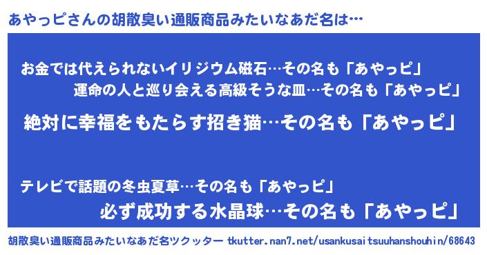 | 男性向けラノベタイトル風あだ名 | 『あやっピという概念が存在しない退屈な世界 』 |