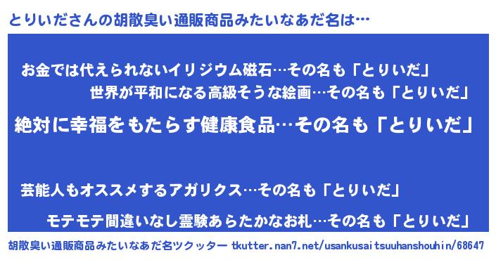 | 男性向けラノベタイトル風あだ名 | 『とりいだという概念が存在しない退屈な世界 』 |
