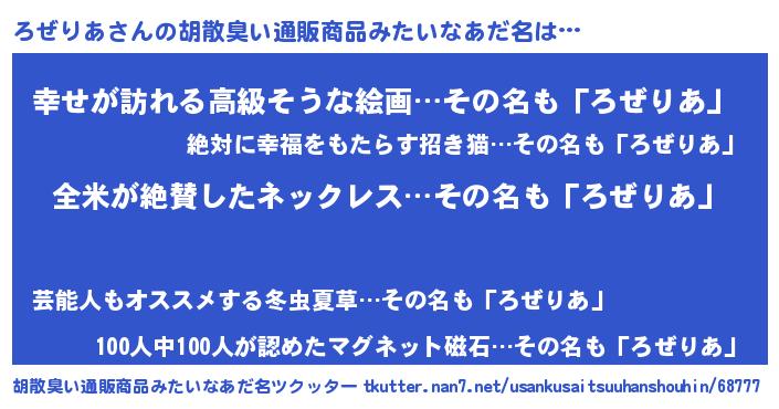 | 男性向けラノベタイトル風あだ名 | 『ろぜりあに滅ぼされるだけの簡単なお仕事です』 |
