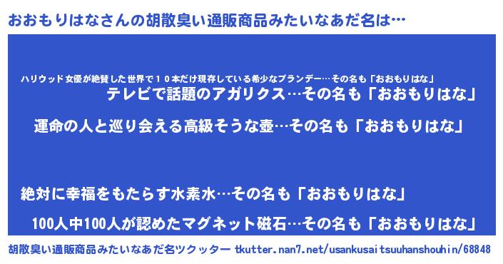 | ヘコむあだ名 | 『酢こんぶ』『おおもりはな(震え声)』 |