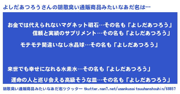 | 男性向けラノベタイトル風あだ名 | 『よしだあつろうの憂鬱』 |