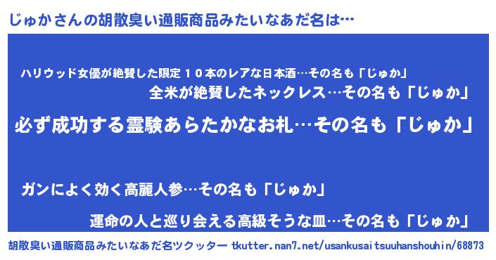 | 男性向けラノベタイトル風あだ名 | 『じゅかの憂鬱』『魔弾の王とじゅか』 |
