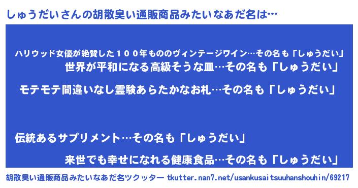 | 男性向けラノベタイトル風あだ名 | 『しゅうだいの憂鬱』『緋弾のシュウダイ』 |