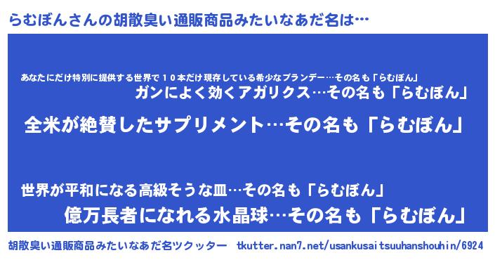 | 男性向けラノベタイトル風あだ名 | 『らむぼんの嫁は女の子じゃないと思った?』 |