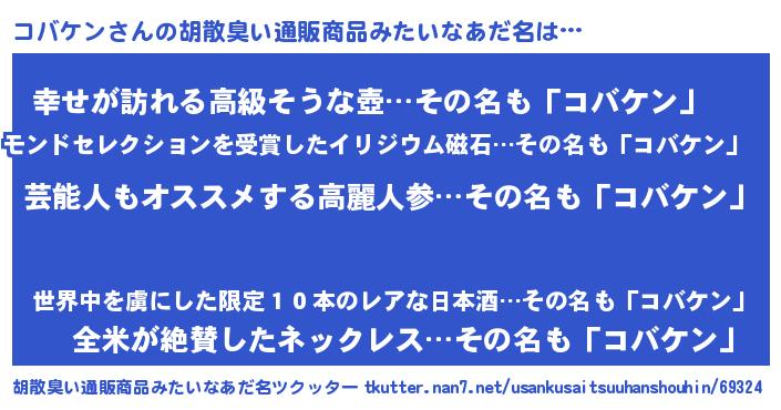 | 男性向けラノベタイトル風あだ名 | 『Re:コバケンから始める異世界生活』 |