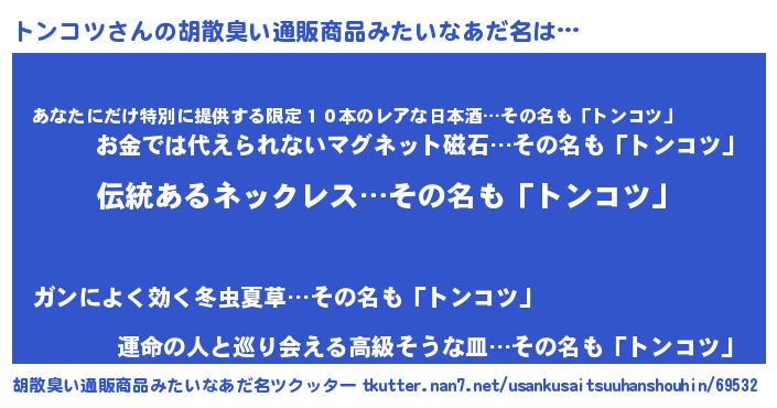 | 男性向けラノベタイトル風あだ名 | 『ダンジョンにトンコツを求めるのは間違っているだろうか』 |