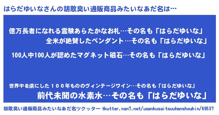 | 男性向けラノベタイトル風あだ名 | 『おまえをオタクにしてやるから、俺をはらだゆいなにしてくれ! 』 |