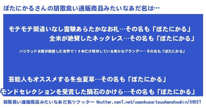 | 意味不明あだ名 | 『住所不定無職ぼたにかる(81歳)』 |