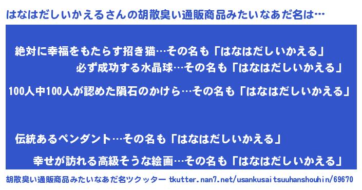 | 男性向けラノベタイトル風あだ名 | 『おまえをオタクにしてやるから、俺をはなはだしいかえるにしてくれ! 』 |