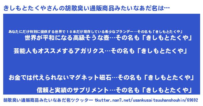 | 男性向けラノベタイトル風あだ名 | 『うちのきしもとたくやが世界を掌握している!』 |
