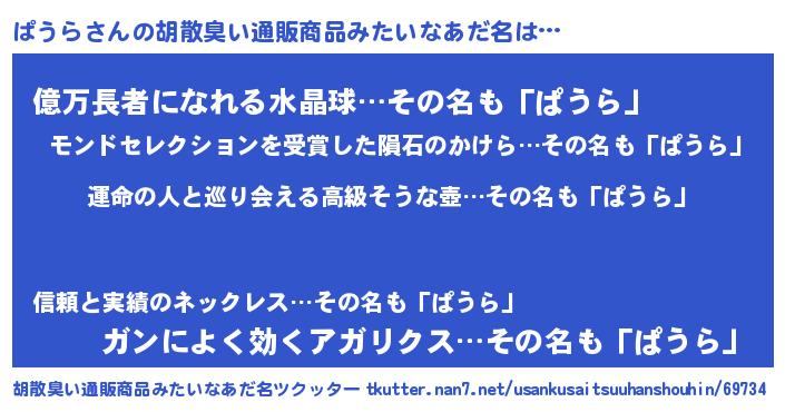 | 男性向けラノベタイトル風あだ名 | 『ぱうら~年齢イコール彼女いない歴の魔法使い~』 |